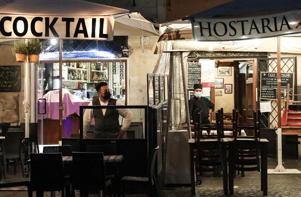 10月26日,意大利首都罗马鲜花广场上两家餐馆临近18时准备打烊。新华社记者程婷婷摄