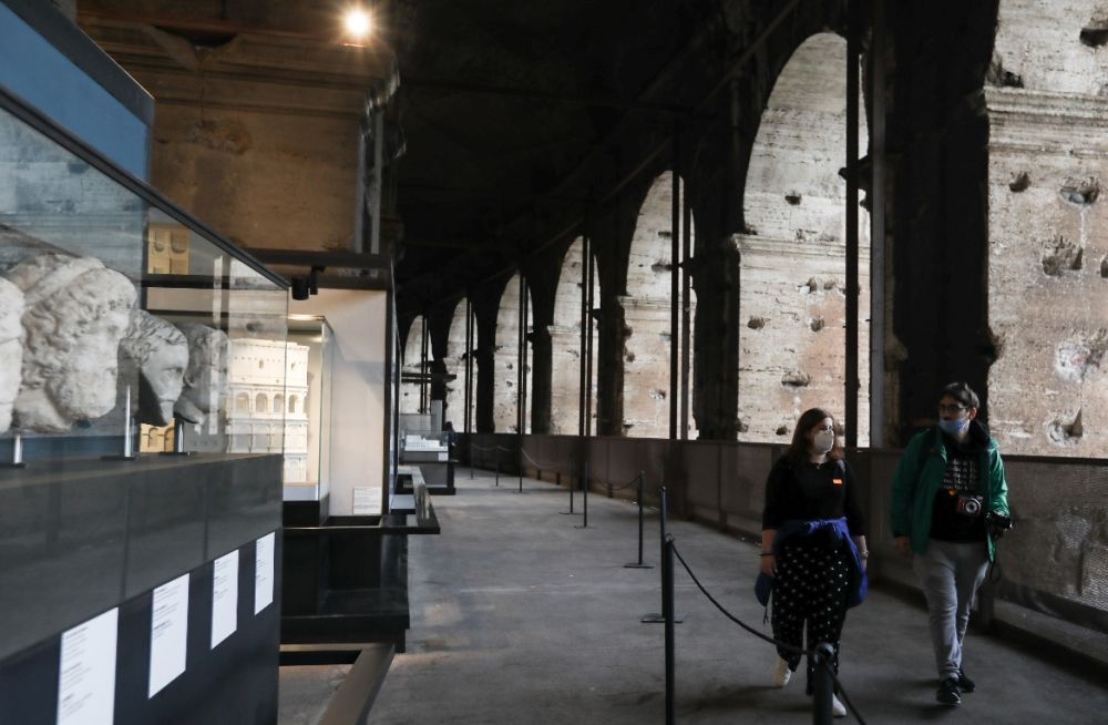 11月4日,游客在意大利首都罗马戴着口罩参观斗兽场。新华社记者程婷婷摄