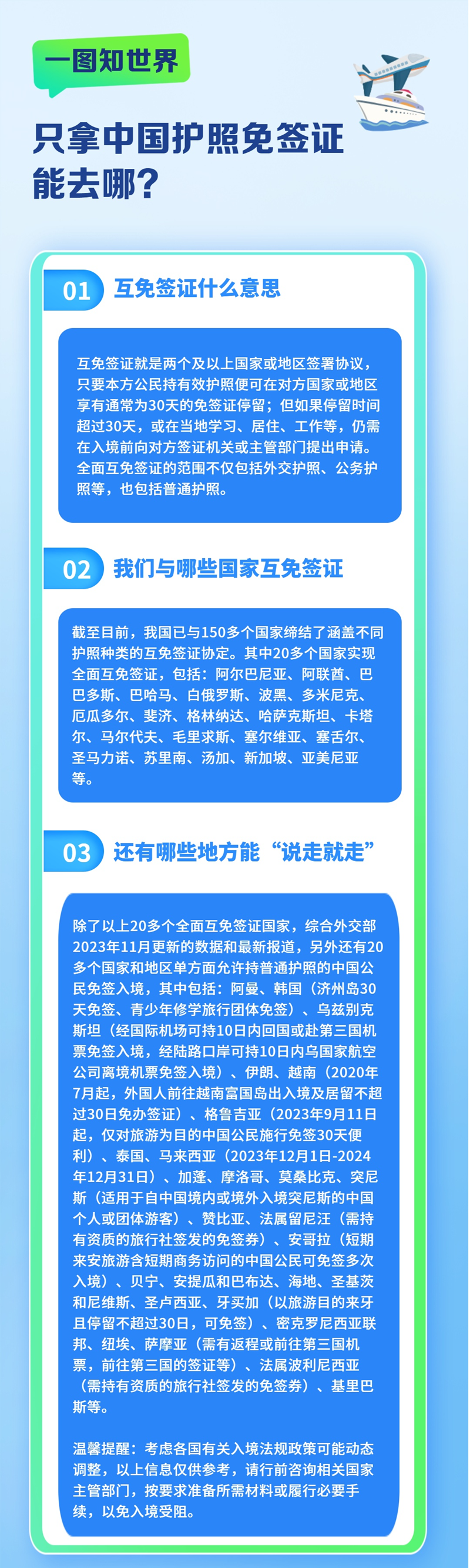 不少人表示中国护照“含金量”又上升了。这里的互免签证是什么意思?我们与哪些国家互免签证?还有哪些地方能只拿中国护照免签证“说走就走”?我们来一图读懂——