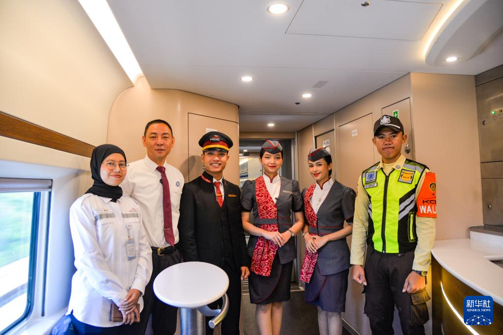 2月7日,在印度尼西亚行驶中的雅万高铁高速动车组车厢内,雅万高铁运维联合体团队中方工作人员郭睿涛(左二)和印尼同事一起合影。新华社记者 徐钦 摄