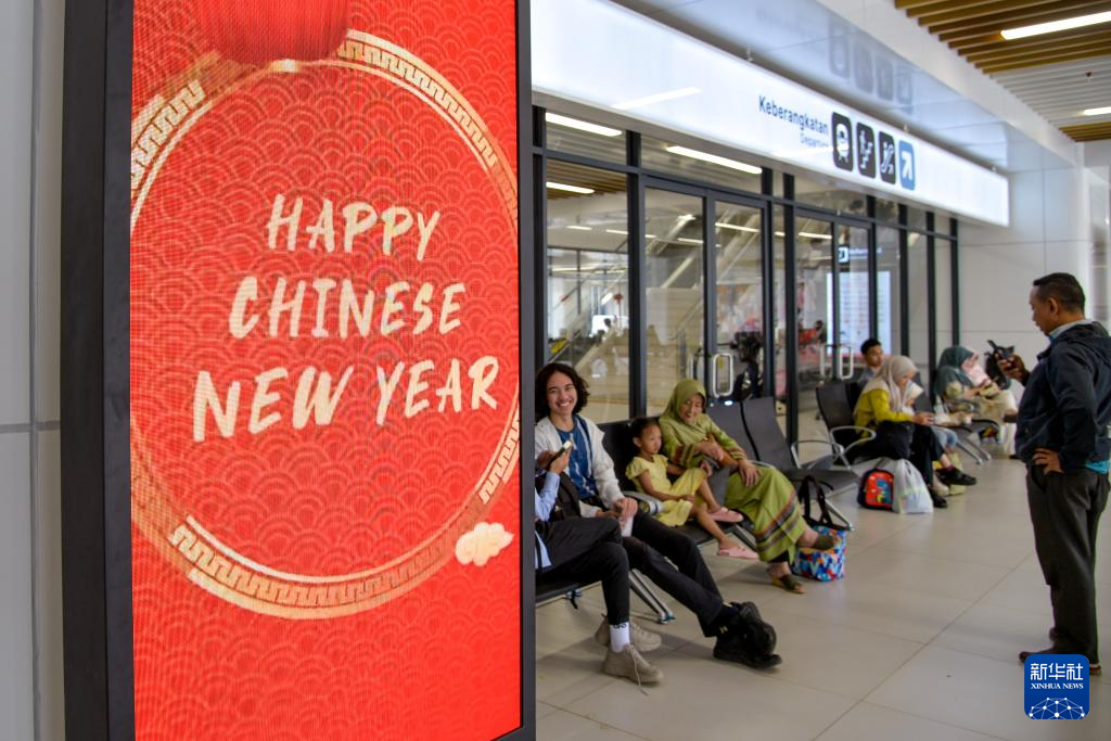 2月7日,在印度尼西亚雅加达哈利姆站,广告屏幕上显示有“春节快乐”的英文字样。新华社记者 徐钦 摄