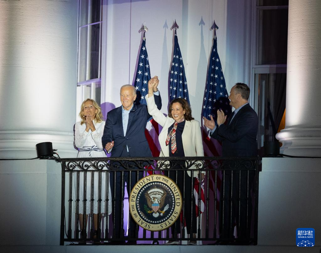 这是7月4日在美国华盛顿白宫拍摄的美国总统拜登(左二)和副总统哈里斯(右二)。新华社记者 胡友松 摄