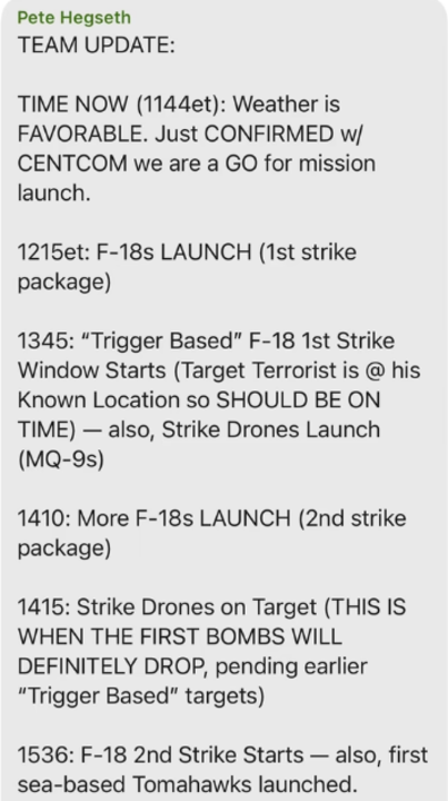 美国记者曝光赫格塞思在安全高官聊天群中上传的美军作战计划截图。