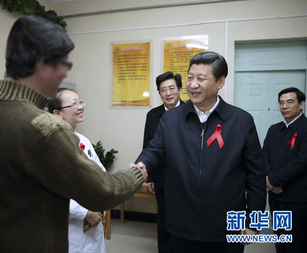 在世界艾滋病日,习近平特地来到北京一家社区药物维持治疗门诊部,同艾滋病感染者握手交谈,和志愿者互动交流,了解艾滋病的预防和治疗情况,强调要全民参与、全力投入、全面预防,让每个艾滋病感染者和病人都感受到党和政府的关怀、感受到社会的温暖。