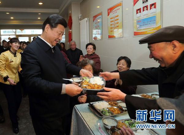 2013年2月4日,习近平在甘肃兰州考察时为七旬老人端饭。 新华社记者 兰红光 摄