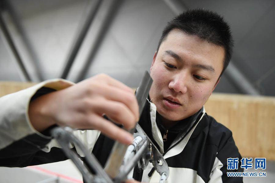 1月27日,中国制冰师朱永涛在调整修冰工具。新华社记者 张晨霖 摄