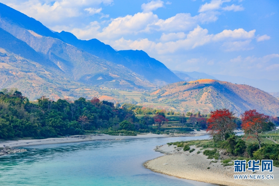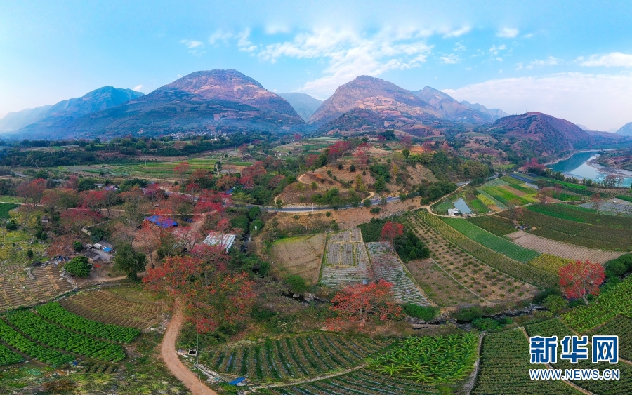 航拍保山施甸怒江之畔木棉花开。新华网发(杨磊 摄)