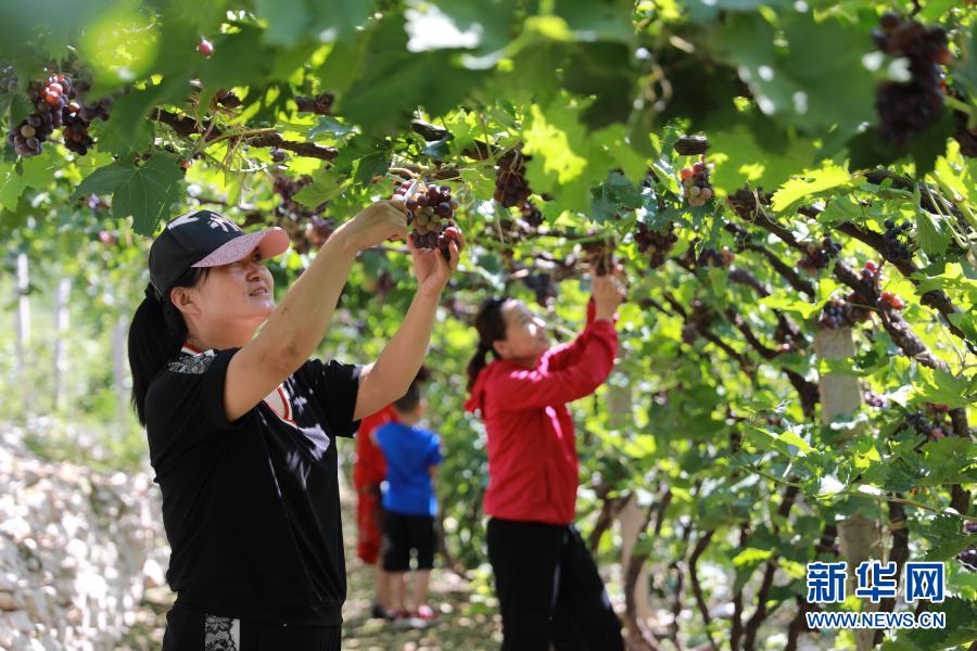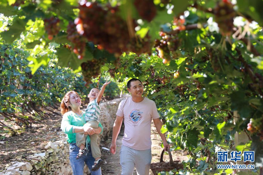游客在沙石峪葡萄园里采摘葡萄(2019年8月摄)。新华社发