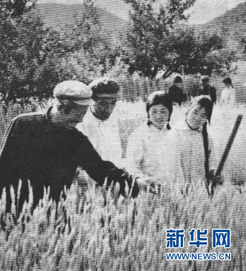沙石峪村老党支部书记张贵顺和村民查看庄稼长势(翻拍资料照片)。新华社发