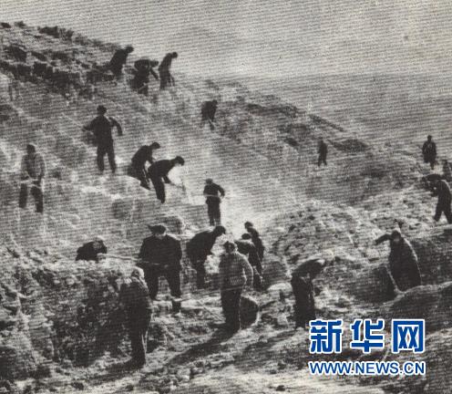 沙石峪村民担土劳作场景(翻拍资料照片)。新华社发