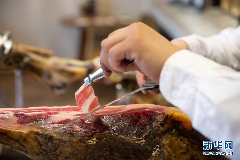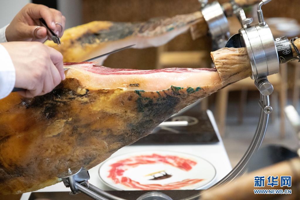 这是4月21日在西班牙马德里的一家餐馆拍摄的敖司堡集团5J火腿。新华社记者 孟鼎博 摄