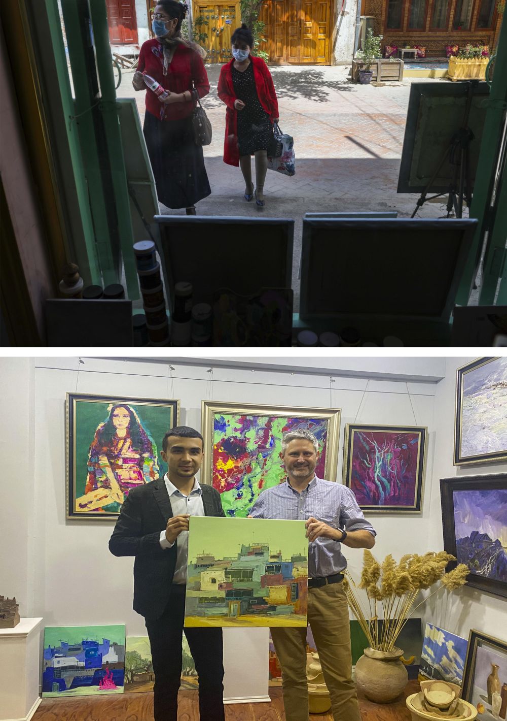 ↑拼版照片:上图为两名行人在麦麦提吐尔逊江的工作室外观看画作(5月8日,新华社记者胡虎虎摄);下图为“五一”期间,一名来自乌克兰的游客(右)购买画作后与麦麦提吐尔逊江合影(受访者供图)。