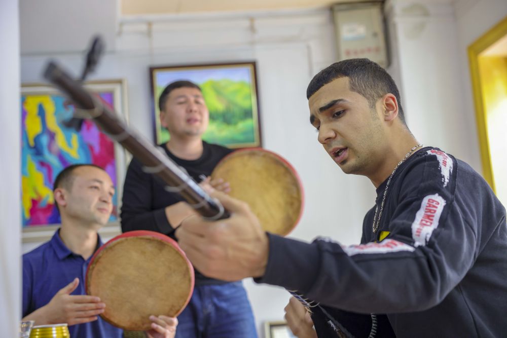 ↑麦麦提吐尔逊江·麦麦提依明(右)在工作室内和朋友唱歌(5月5日摄)。