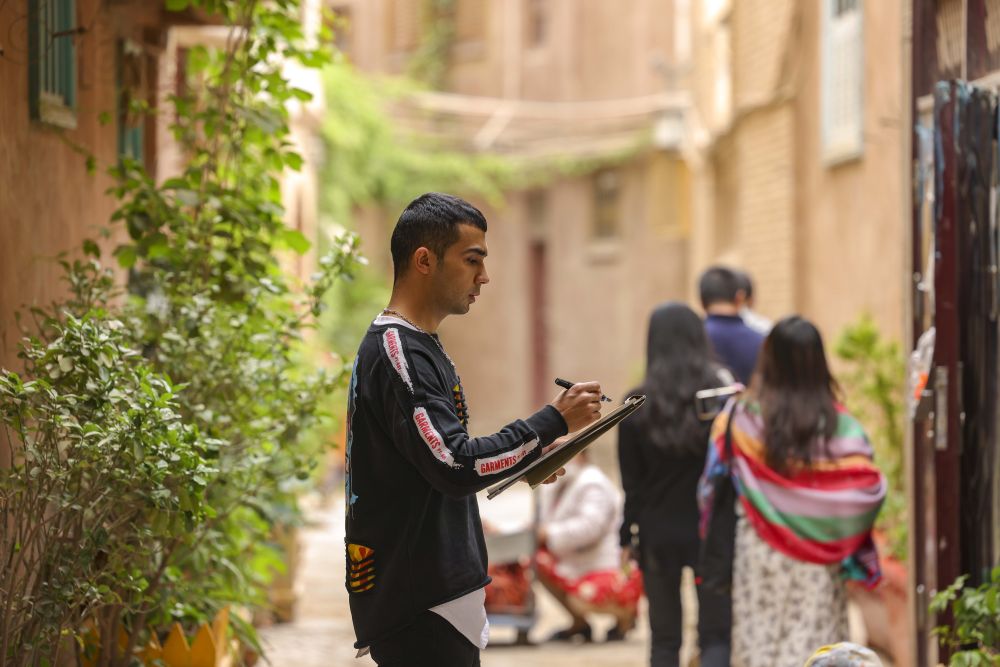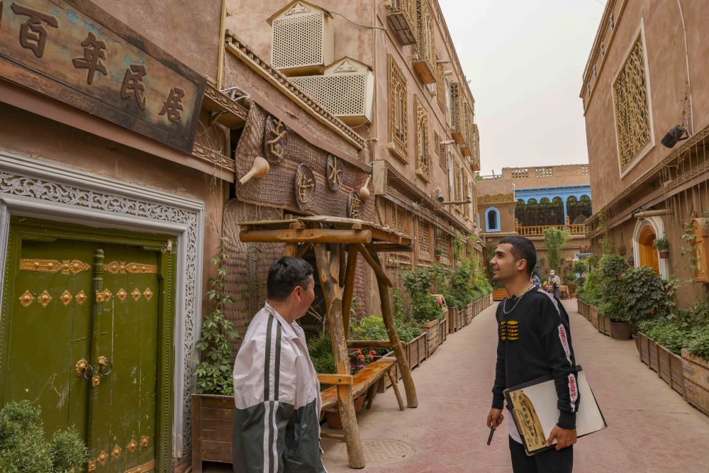↑麦麦提吐尔逊江·麦麦提依明(右)和朋友在新疆喀什古城景区寻找创作素材(5月6日摄)。