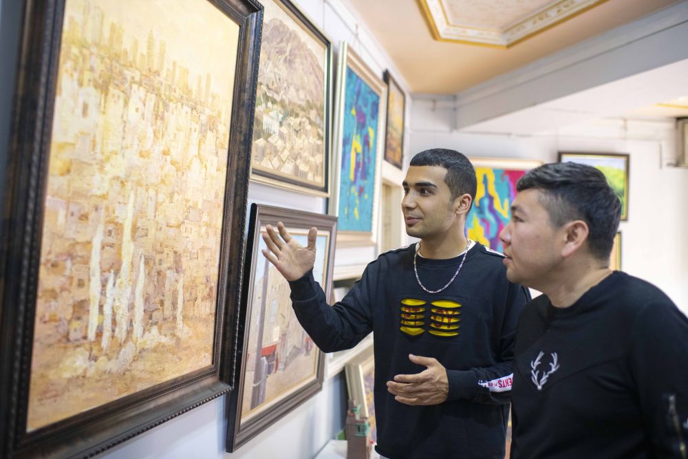 ↑麦麦提吐尔逊江·麦麦提依明(左)在工作室内向朋友介绍他创作的关于喀什的画作《走进新时代》(5月5日摄)。