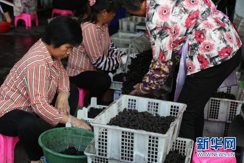 在汕头市潮阳区金灶镇,村民们正忙着分拣成熟的桑葚。新华网 朱皓 摄