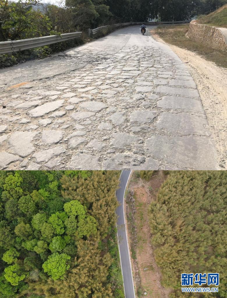 拼版照片:上图为修缮前的Y159金高线,坑洼不平的路面为群众出行带来不便(资料图);下图为修缮后的Y159金高线,道路平坦整洁。新华网 朱皓 摄