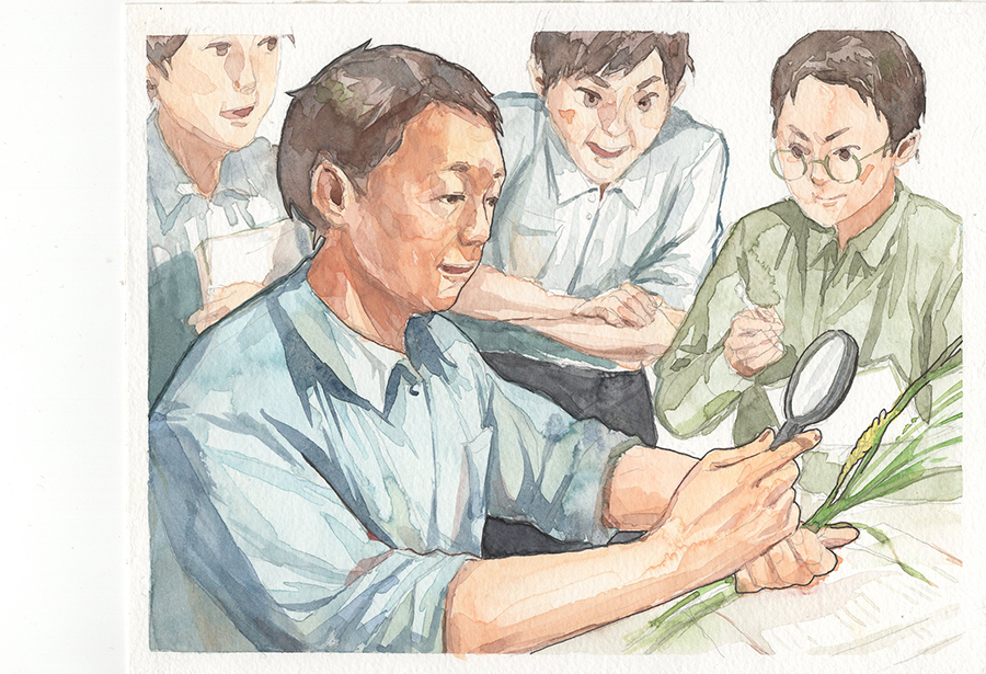 袁隆平在研究超级杂交稻技术过程中,为了找到理想的稻株,他带着学生们每天早早下田,饮食只靠水壶和馒头。六七月份的炎热天气,他们每天拿着放大镜,一垄垄一穗穗地在稻株中寻找。1961年的一天,袁隆平发现了一株颗粒饱满的稻株。他满心欢喜地把稻株带回实验室,和学生们一起,仔细观察,小心翼翼地做标记、培育,期待来年亩产实验的大增收。