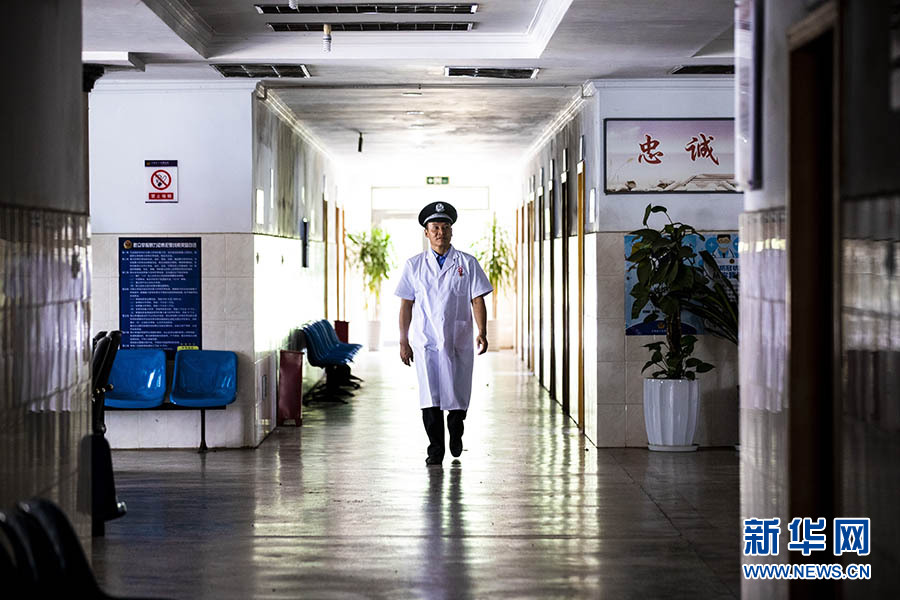 “从学医的第一天起,老师就告诉我们,对待病人要一视同仁。”多年来,面对高墙之内的特殊病患,桂家华秉持医者仁心,尽心尽力地开展诊治。图为桂家华在巡查楼层并询问服刑人员身体状况。新华网发(念新洪/文 王宏兵/摄)