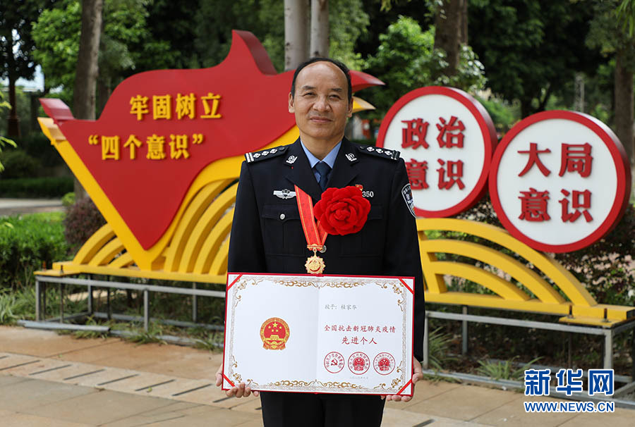 在湖北武汉,桂家华和云南医疗队的其他医护人员一起,负责方舱医院两层确诊患者的救治工作,经过56天的艰苦奋战,300余位病人全部治愈出院,圆满完成了抗疫任务。2020年9月,桂家华被授予“全国抗击新冠肺炎疫情先进个人”荣誉称号。图为桂家华获表彰后留影。新华网发(念新洪/文 受访者供图)