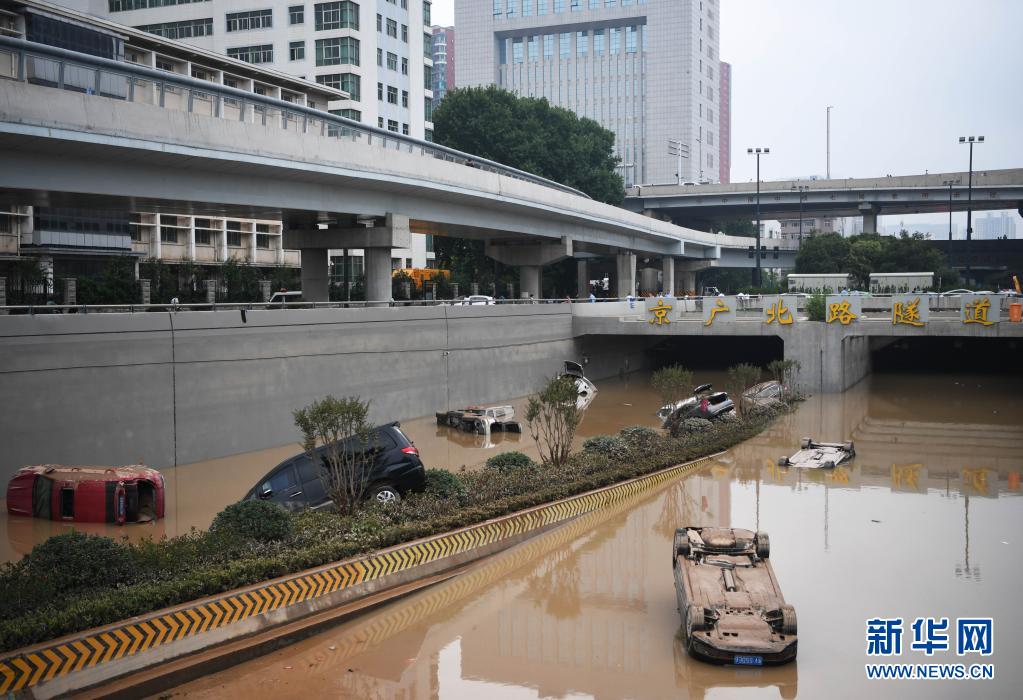 7月22日,在郑州京广路隧道口,被淹的机动车露出水面。新华社记者 张浩然 摄