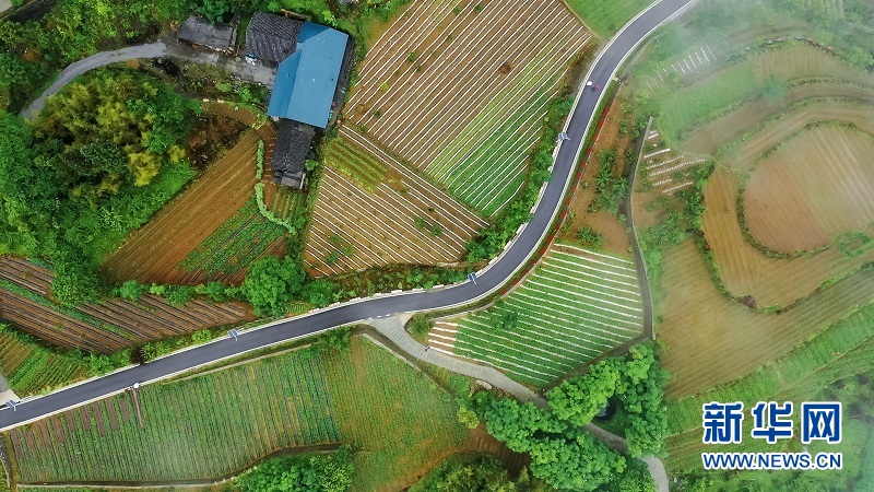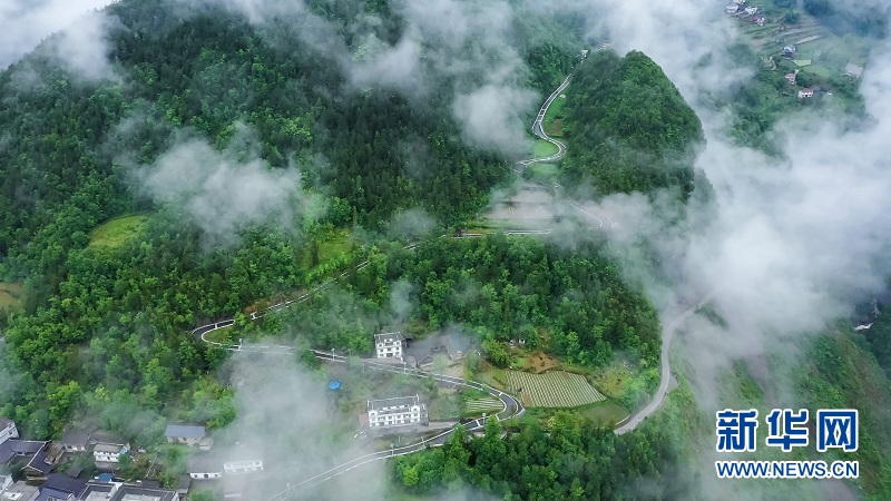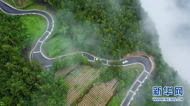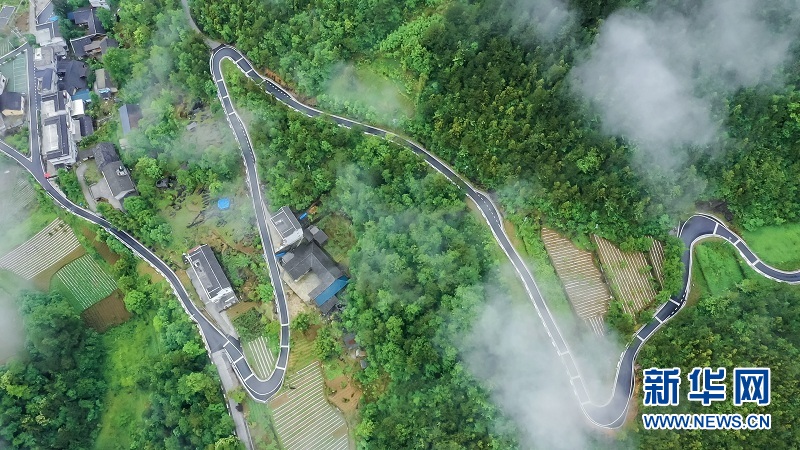 图为玉带般的通村公路绕山而上,串起店子坪美丽乡村新画卷。新华网发 候康摄