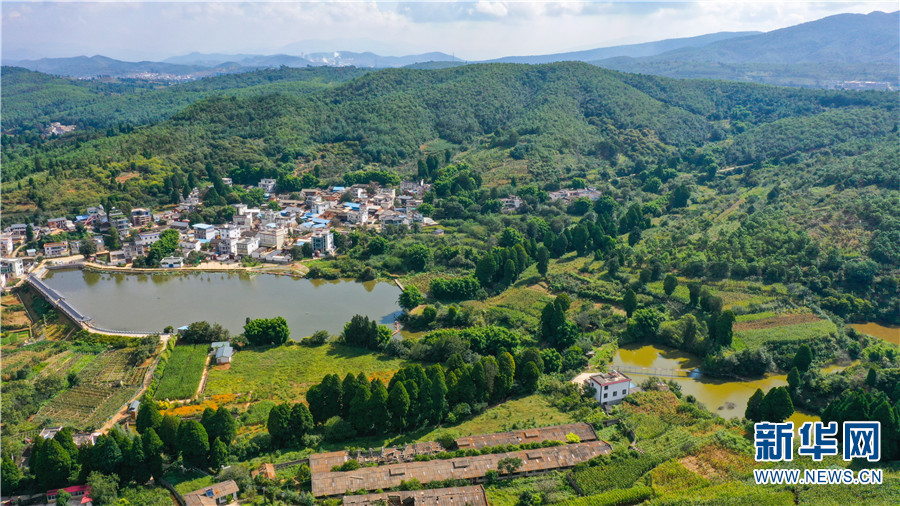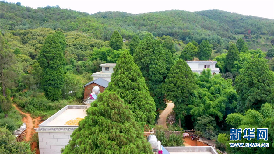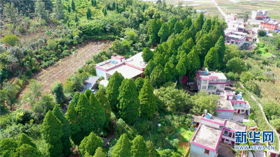 航拍滇翠柏装点下的大庄村(9月23日摄)。新华网发(安宁市融媒体中心供图)