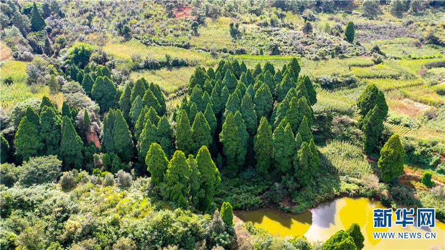 航拍大庄村的滇翠柏(9月23日摄)。新华网发(安宁市融媒体中心供图)