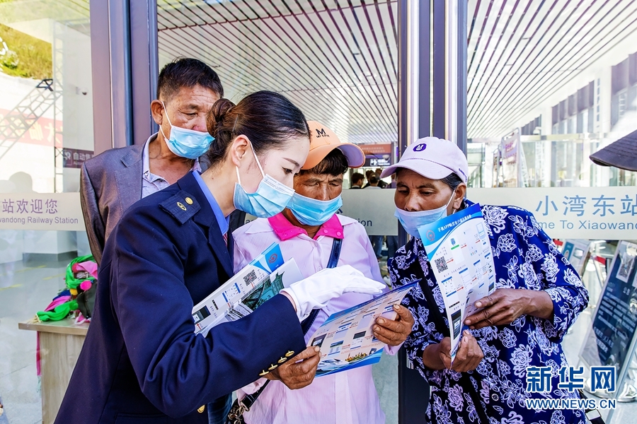 小湾东站,工作人员向当地群众介绍购票流程(摄于11月6日)。新华网发(梁颖/摄)