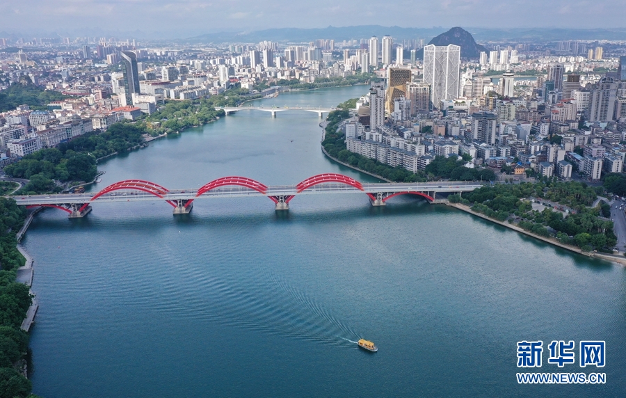 夕阳下的柳江柳州市区河段(2021年6月7日摄,无人机照片)。新华社记者 黄孝邦 摄