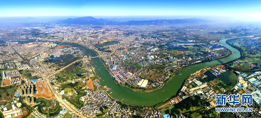 西江黄金水道上的广西贵港市全景(2018年3月9日摄,无人机照片)。新华社记者 周华 摄