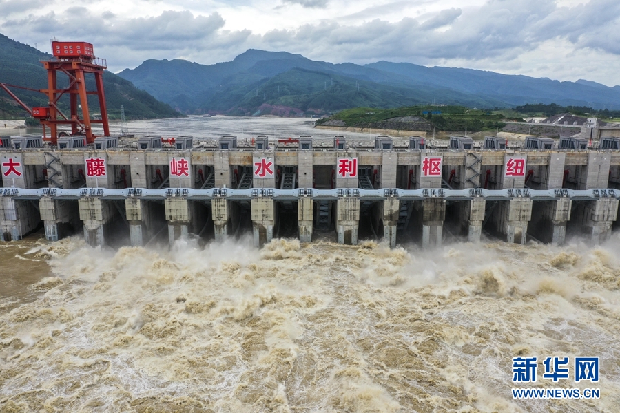 广西大藤峡水利枢纽工程开启泄水闸泄洪(2021年7月2日摄,无人机照片)。新华社记者 曹祎铭 摄