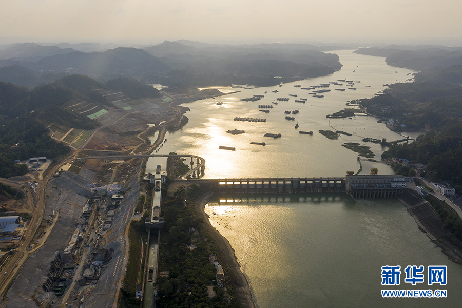 无人机航拍横县西津水利枢纽二线船闸工程(2021年3月19日摄)。新华网 刘君 摄