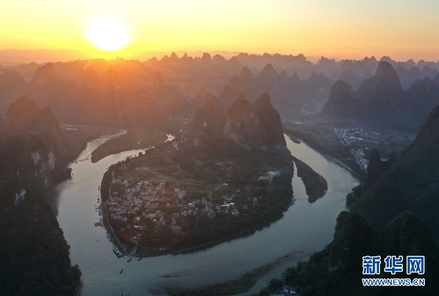 夕阳下的漓江广西桂林市阳朔县兴坪段景色(2021年11月25日摄,无人机照片)。新华社记者 周华 摄