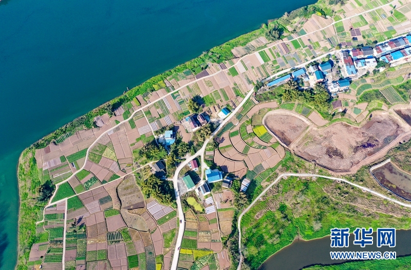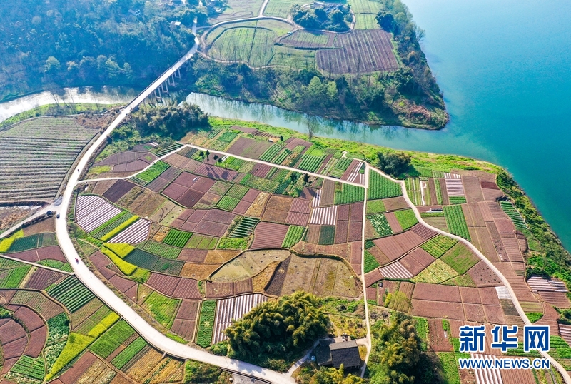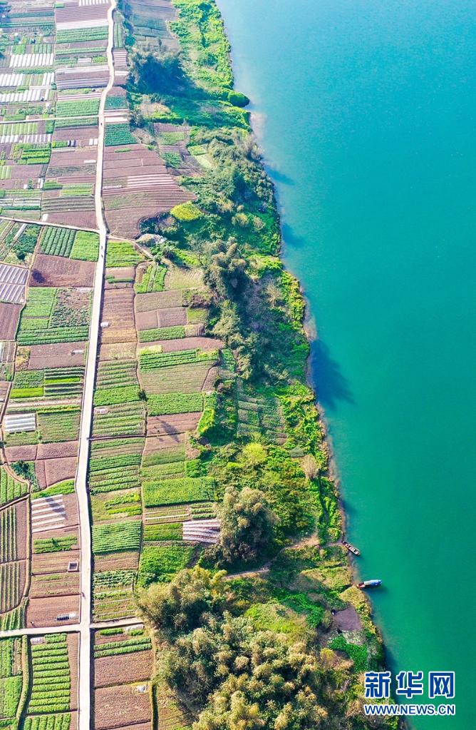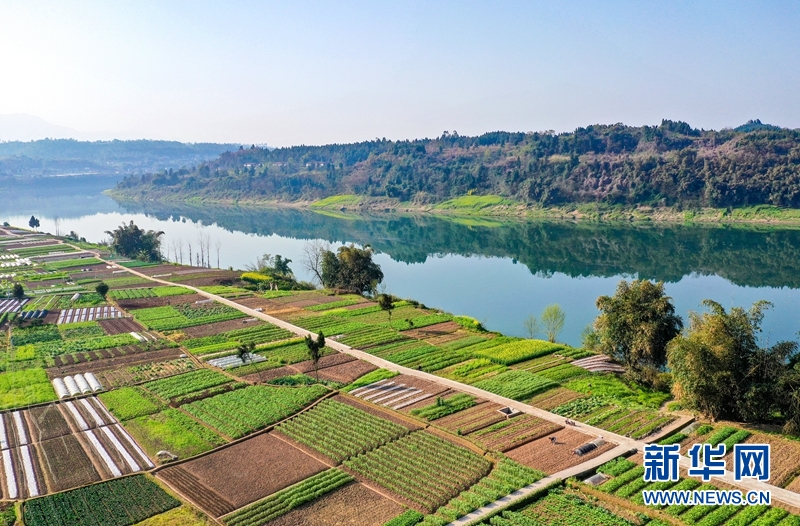 图为2022年3月8日,位于四川省广安经开区护安镇涌坝村的无污染蔬菜基地,在江水、菜花和农作物的装点下,生机盎然、美丽迷人(无人机拍摄)。新华网发(邱海鹰 摄)