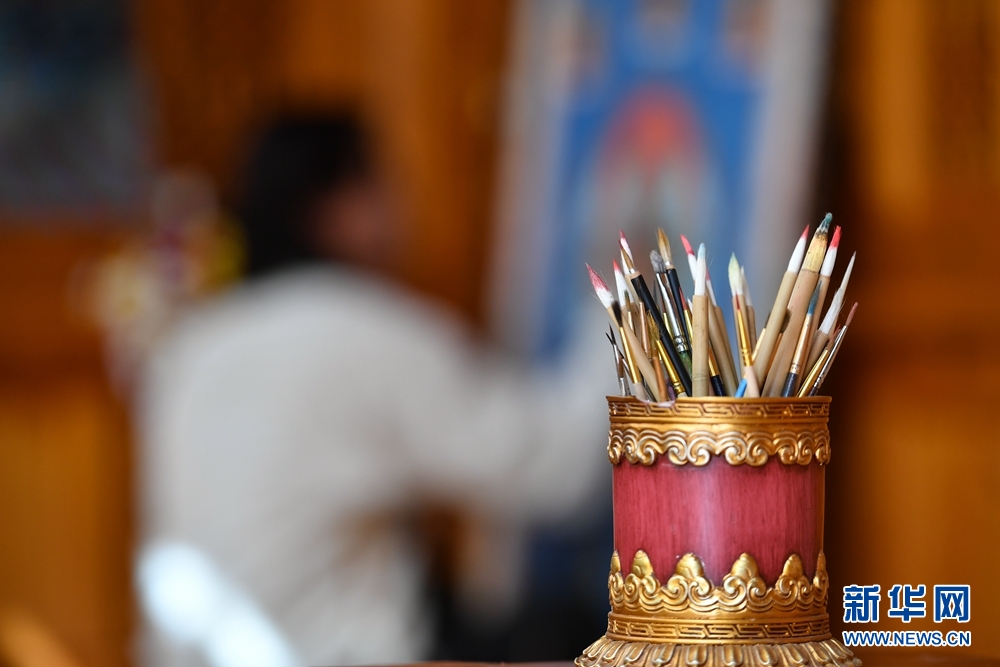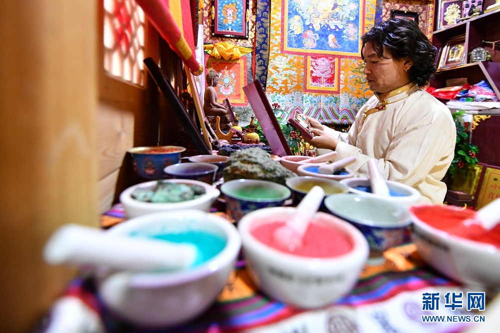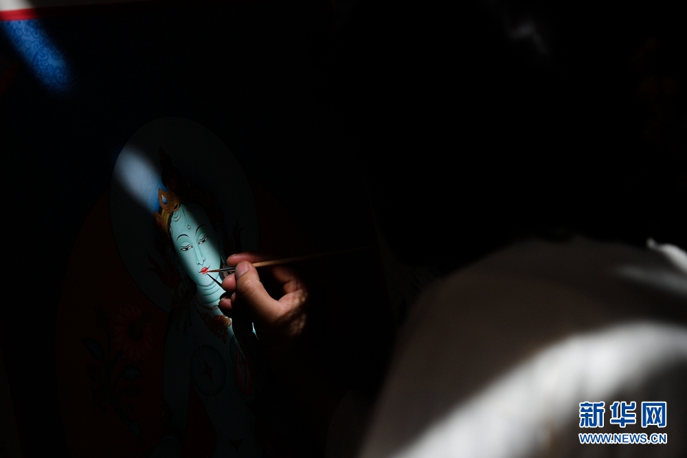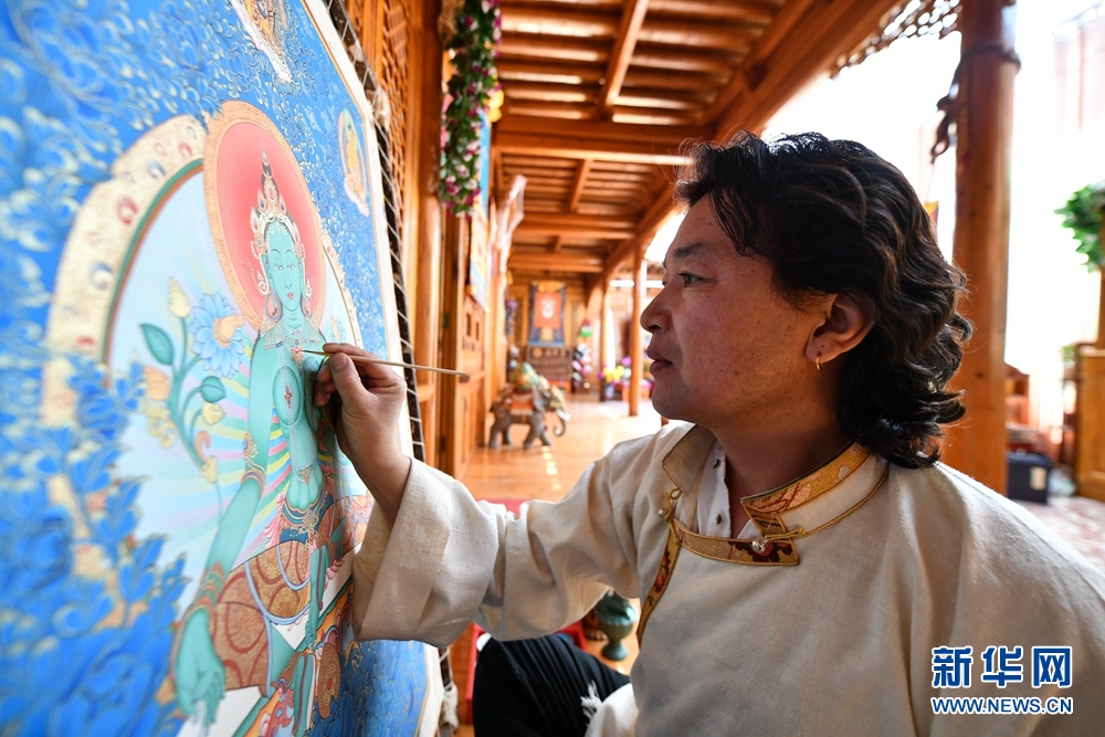 为了更好地传承和发扬热贡唐卡绘画技艺,格桑嘉措又相继拜多名唐卡大师为师,虚心接受指导,刻苦练习唐卡技艺,将大师们高超的绘画技艺与家传技艺融会贯通,使得他的绘画功底得到了很大的提升。图为格桑嘉措在绘制唐卡作品。