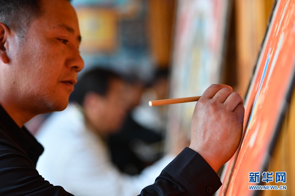 作为热贡艺术传承人及致富带头人,格桑嘉措2013年创办了格桑热贡艺术传播中心,在自己居住的四合院中设立唐卡展厅,收徒办学,累计培养热贡艺人30多人。图为格桑嘉措的徒弟达巴在绘制唐卡。