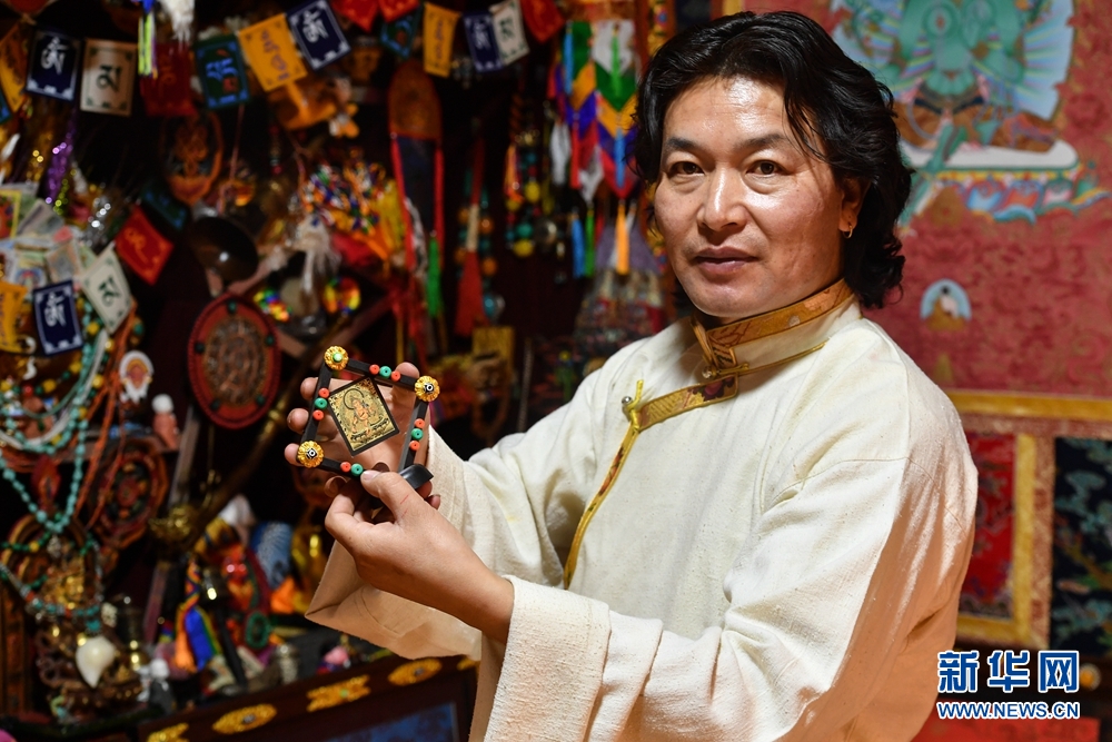 同仁市“脱贫攻坚社会扶贫先进个人”、黄南州“优秀共产党员”、青海省“绿色家庭示范户”……近年来,格桑嘉措不仅通过自己的努力,带动当地贫困户就地创业,还积极投身各项公益活动中,自2014年至今,已累计捐款捐物72万元。图为格桑嘉措在唐卡展厅内整理他创作的文创产品。