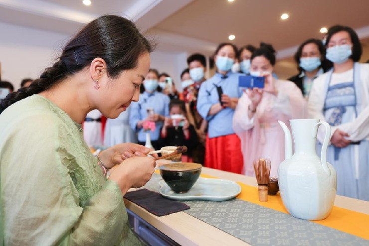 “穿越”宋朝,体验宋人的风雅日常,活动现场还穿插了宋人点茶画汤技艺展示环节,碾茶、撮末于盏、点茶……茶艺技师通过举止轻缓却不失流畅的动作,一边向观众展示点茶技艺,一边为他们讲解茶文化,让现场观众深深体味茶香之美、慢生活之美。