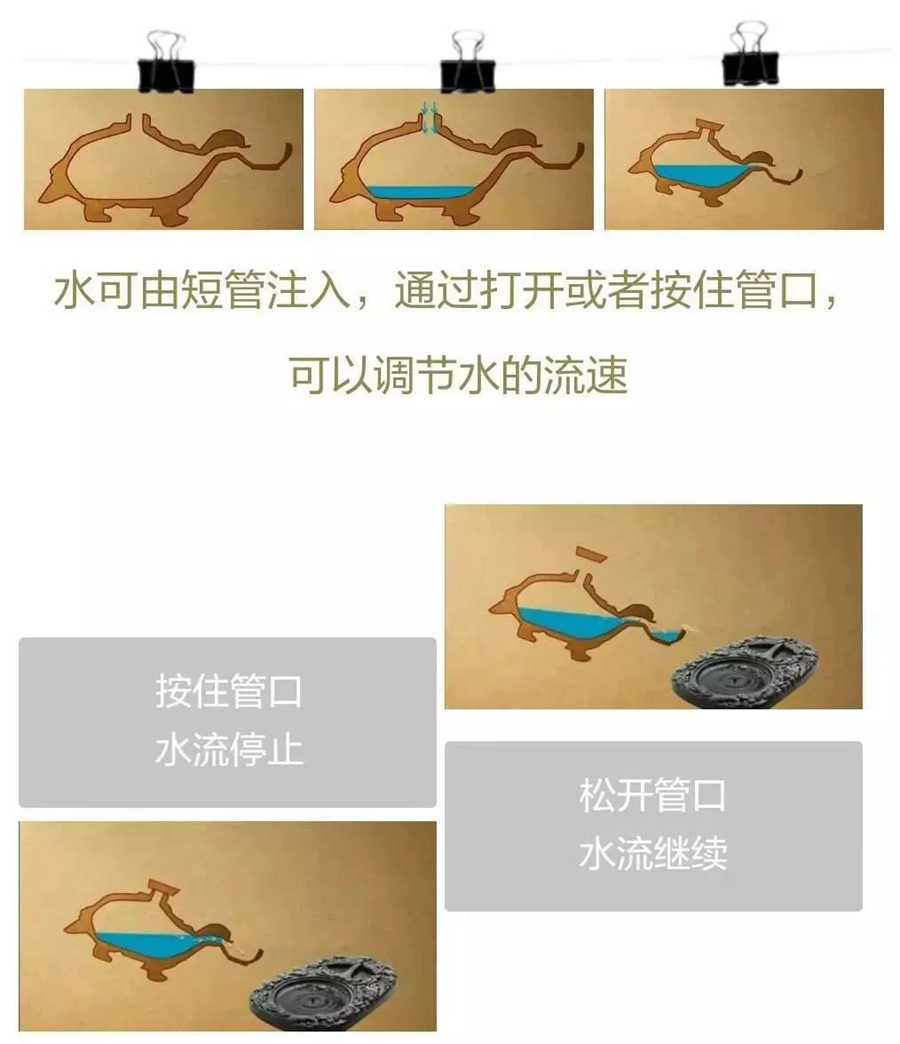 最初古人使用各种形状的水壶、水盂注水研墨。用这些器皿,往砚池里倒水时,水的流量往往很难控制。于是聪明的古人在水壶、水盂的基础上,发明了便于控制出水量的砚滴。