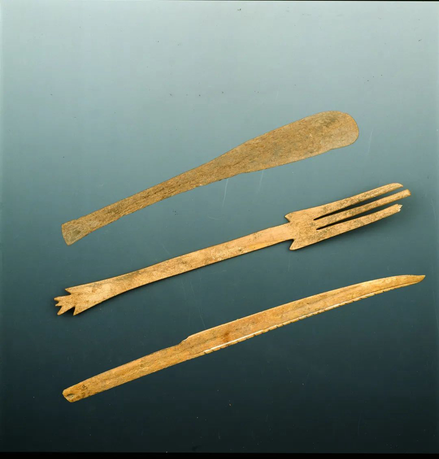 宗日遗址以其精美的彩陶,尤其是画有人像图案的彩陶盆,给黄河上游远古文化绘就了一层辉煌的色彩。该遗址出土的骨制餐具在彩陶的掩映下,放射出夺目的光芒,吸引了众多人的眼球。这些骨餐具包括骨叉、骨勺、骨刀等若干件。