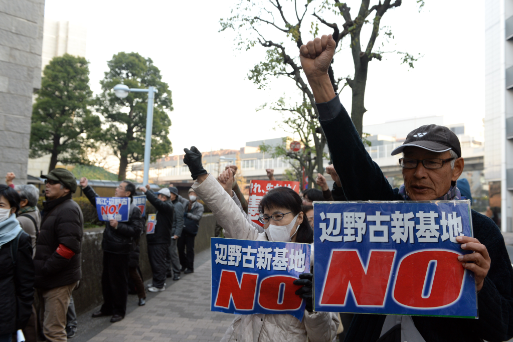 2016年12月20日,在日本首都东京,民众在日本最高法院外抗议判决结果。当日,日本最高法院就日本中央政府诉冲绳县政府“非法叫停”美军新基地建设一案作出终审判决,维持福冈高等法院那霸分院一审判决结果,裁定冲绳县败诉。新华社记者马平摄