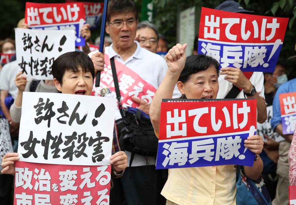 2016年6月19日,在日本首都东京,市民手举“绝不容忍女性杀害事件”和“(美国)海军陆战队撤出”的标语。新华社记者刘天摄