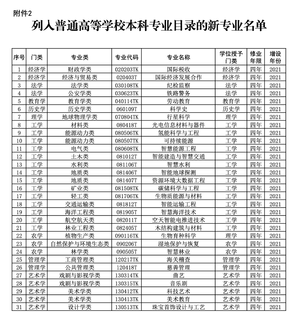 教育部公布的2021年度普通高等学校本科专业备案和审批结果显示,新增31种本科专业,涵盖工学、经济学、法学、艺术学等九大学科门类。