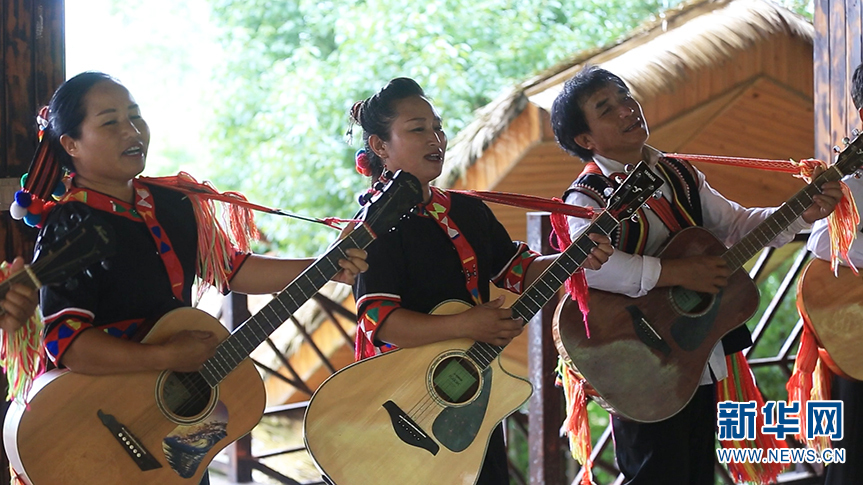 老达保村民在表演吉他弹唱(6月9日摄)。新华网发(张家杰 摄)
