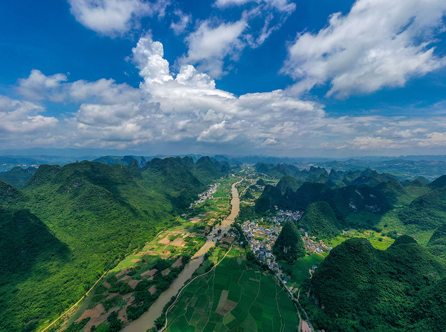 广西桂林市阳朔县在阳光的照耀下,山水与蓝天白云构成一幅美丽的山水画卷。(新华社记者 曹祎铭 摄)