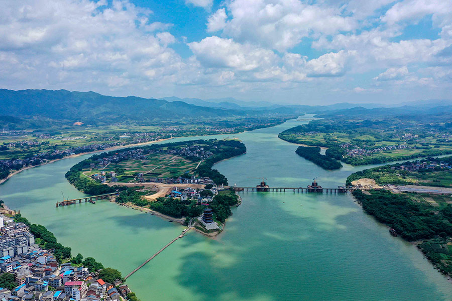 广西柳州市融安县段天气晴好,江水碧绿,蓝天白云下的融江宛如一条玉带镶嵌在桂北大地。 新华社发(谭克兴 摄)