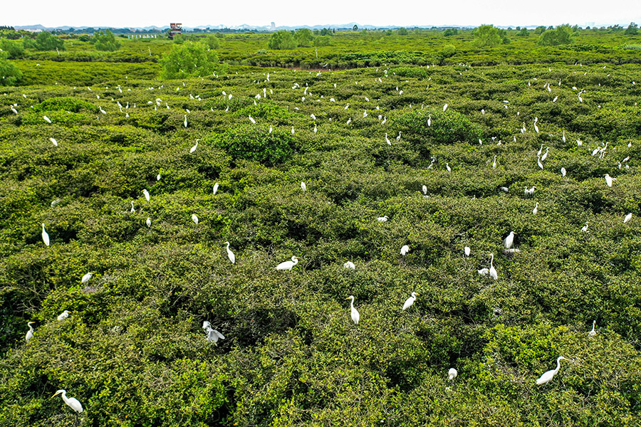 时下正是白鹭繁殖的季节,在广西钦州市钦南区安州大道附近沿海的红树林里,成群白鹭在此休憩觅食。(新华社记者 周华 摄)