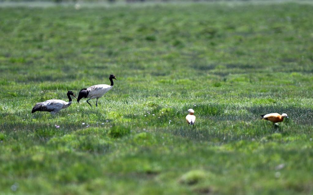2022年7月2日,两只黑颈鹤(左一和左二)在青海隆宝国家级自然保护区内活动。新华社记者 韩方方 摄