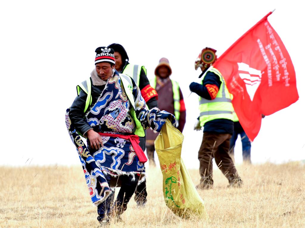 在三江源国家公园黄河源园区,扎陵湖乡生态保护站勒那村生态管护队第七组的队员在捡拾垃圾(2018年12月2日摄)。新华社记者 张龙 摄